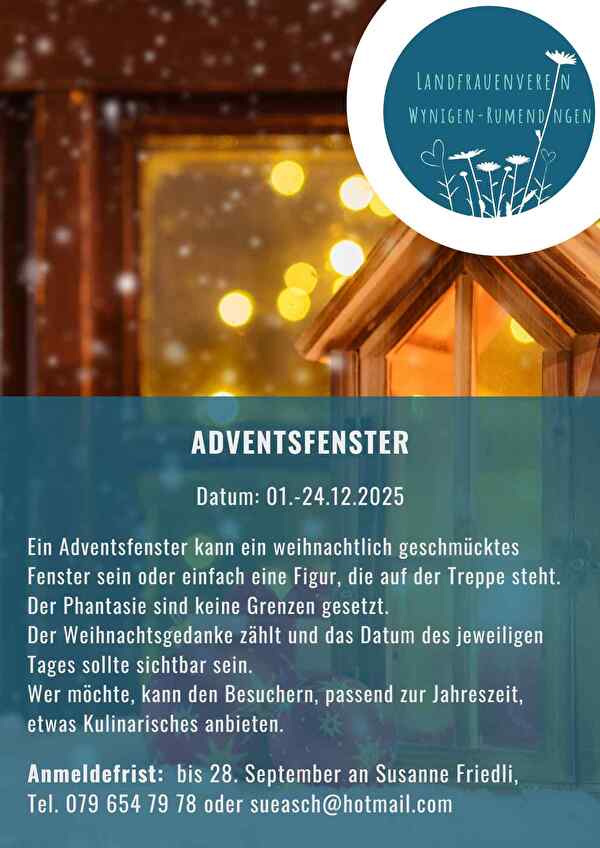 Die Liste der teilnehmenden Adventsfenster werden im der Wyniger-Poscht, im Gemeindeblatt Rumendingen und auf unserer Homepage www.landfrauen-wy-ru.ch publizieren.